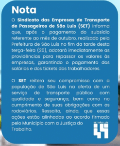 O Sindicato das Empresas de Transporte de Passageiros de São Luís (SET) informou, na tarde desta terça-feira (25), que iniciará imediatamente o repasse do subsídio referente ao mês de outubro às empresas operadoras do sistema de transporte público da capital. O valor foi pago pela Prefeitura de São Luís no fim da tarde e permitirá o cumprimento das obrigações trabalhistas com motoristas, cobradores e demais funcionários.